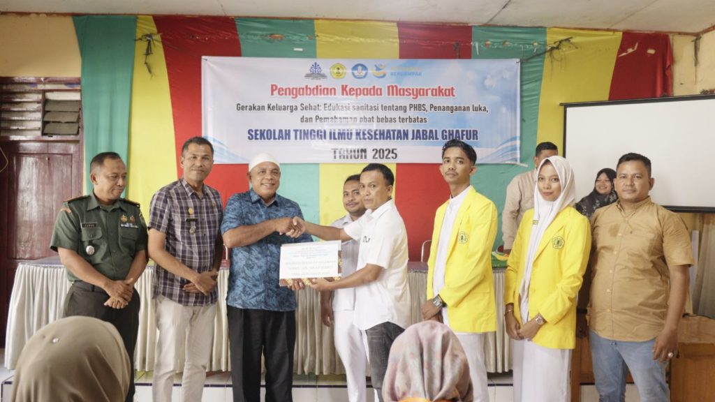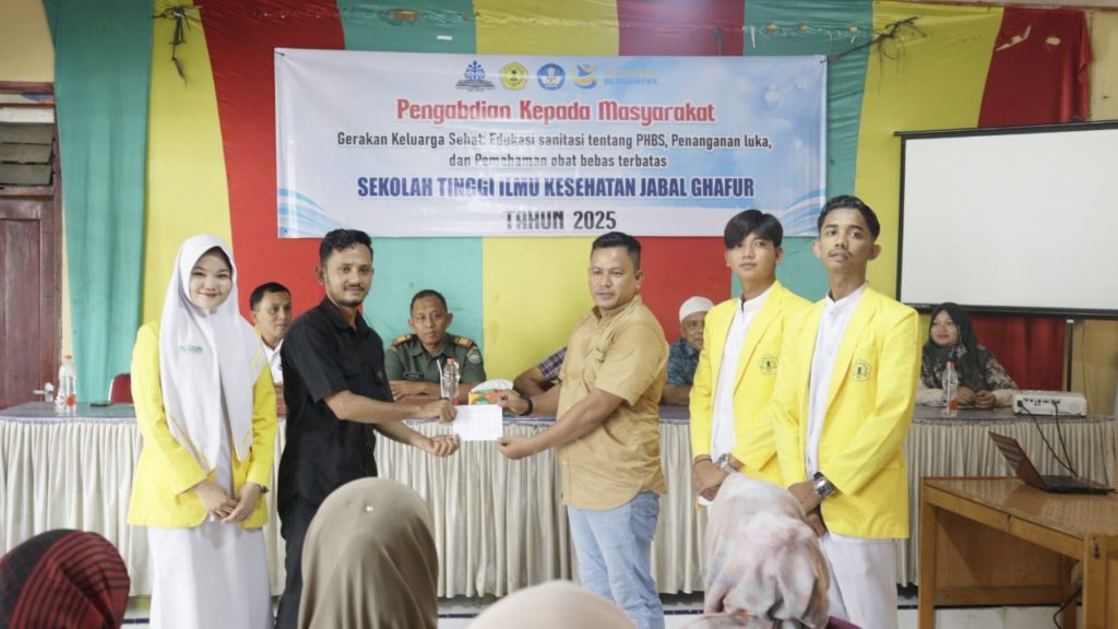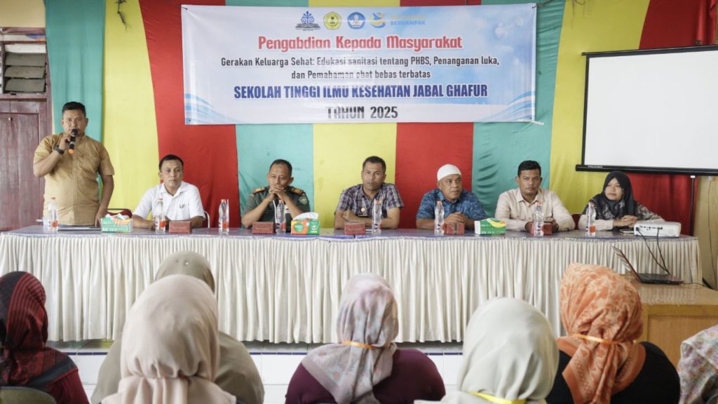 Kegiatan ini mengusung tema “Gerakan Keluarga Sehat: Edukasi Sanitasi tentang PHBS, Penanganan Luka, dan Pemahaman Obat Bebas Terbatas” dan dihadiri oleh unsur Muspika Kecamatan Mutiara Timur, tokoh masyarakat, dosen, serta mahasiswa STIKes Jabal Ghafur.